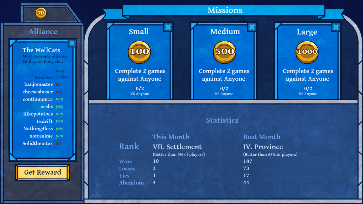 Empire Alliances – Players can now form Alliances with up to 10 members, and each member can earn bonus coins every day based on how active the Alliance is. Over time, we will expand what Alliances are used for (let us know your ideas), but for now it’s a great way to earn coins faster and find friends in the community. Every member in the Alliance gets 10 coins for each member that won a game (Vs Anyone) the previous day (up to 100 coins per day).