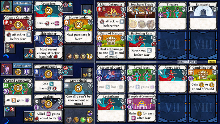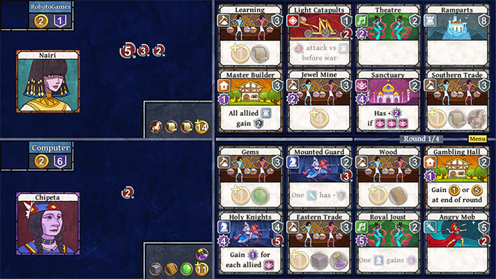 Choose from hundreds of cards ranging from great pyramids and war elephants to sneaky spies and crafty merchants.  Perfectly balance your city’s culture, military and economy to outwit your opponent and win!